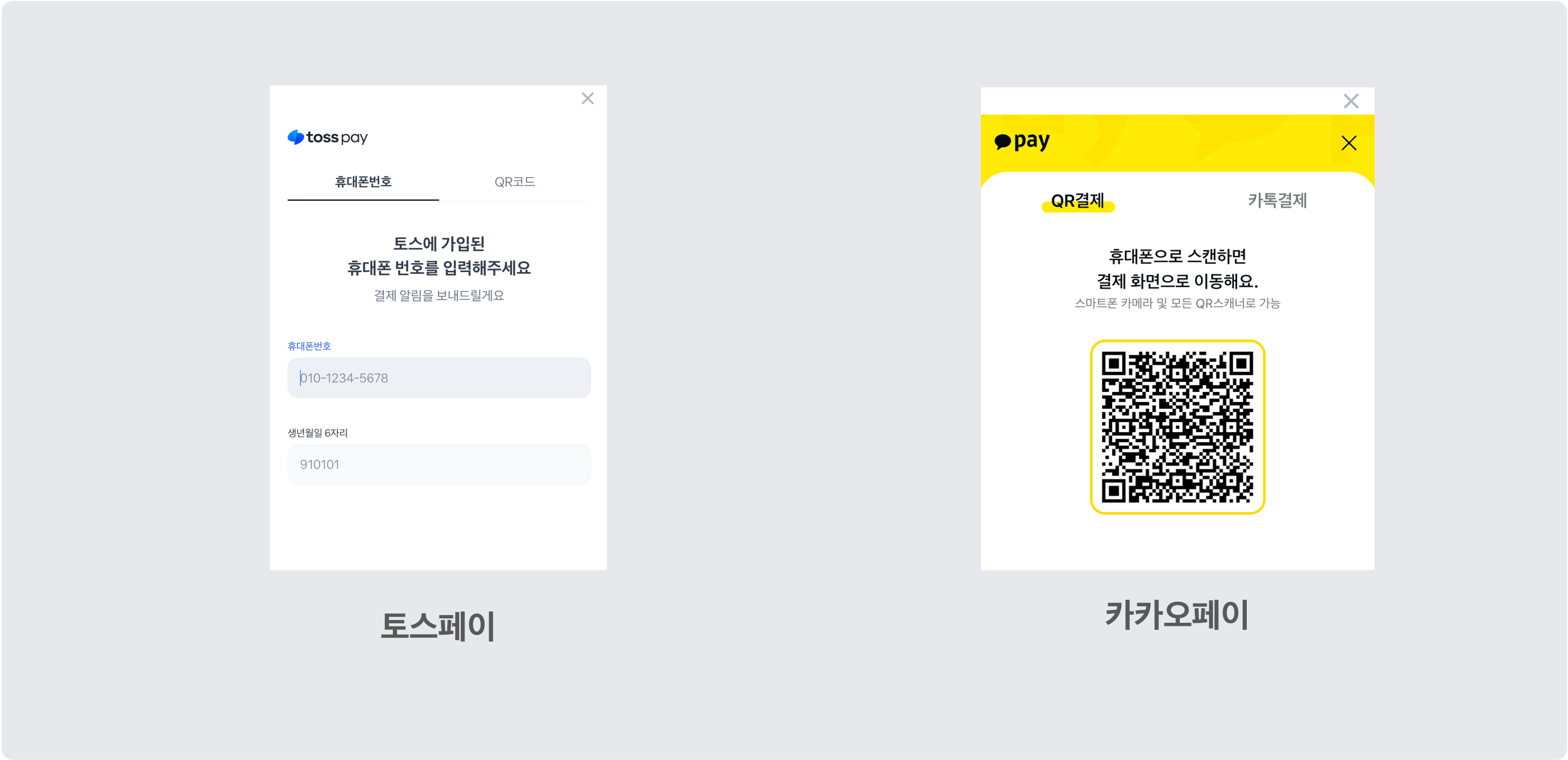 토스페이먼츠가 제공하는 결제 UI를 그대로 사용하는 방식이에요. 한 번의 연동으로 토스페이, 네이버페이, 카카오페이 등 다양한 간편결제를 지원할 수 있어요.