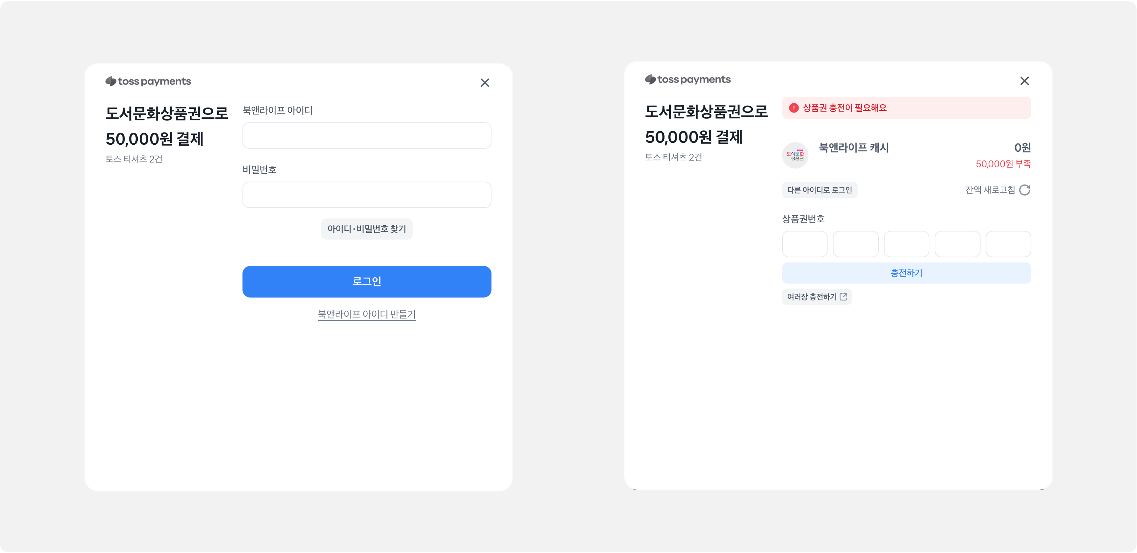 | 1. 인증 | 상품권 계정으로 로그인하거나 PIN 번호를 입력해요 | 결제창에서 ID/PW 또는 PIN 입력 |